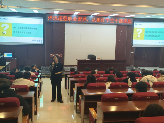 为全面提升学生骨干的综合能力与职业素养,11月10日,我院特邀学校招就处谭帮换老师于玉衡报告厅,作了题为“淬炼超强职业素养,始于担当学生干部”的专题培训。我院学工办主任晏菲老师、团学干部以及各年级班委参加了此次专题讲座。