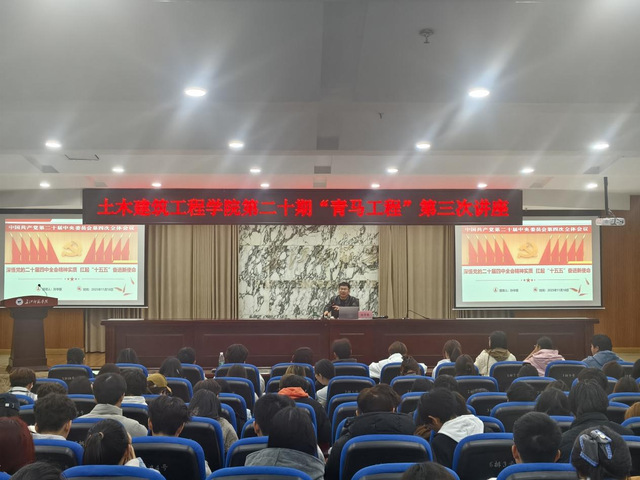 2025年11月18日晚,土木建筑工程学院党委书记孙华银在鉴湖报告厅为第二十期青年马克思主义者培养工程全体学员讲授主题党课,深入解读党的二十届四中全会精神,引导青年学子深刻把握“十五五”时期的发展方向与使命担当。