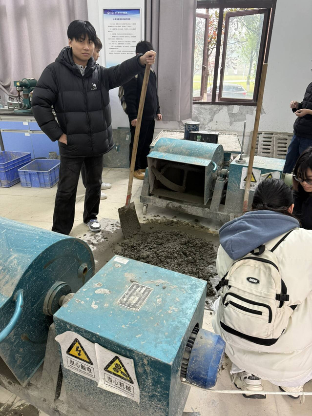 活动现场,学生们以小组为单位,从识读图纸、计算用料开始,历经拌制砂浆、测量放线、逐层砌筑、勾缝修饰等完整工序,完成了一面面轻型砌砖幕墙的实体搭建。不再只是课本上的公式与图示,砂浆的和易性、砌块的吸水率、灰缝的饱满度、墙体的垂直平整度,都成了需要亲手调控和严格把关的“现实参数”。许多同学表示,当亲手砌下第一块砖,才真正理解了“理论与实践相结合”的深刻含义,对材料性能、力学原理和施工工艺有了前所未有的直观体悟。“横平竖直、灰缝均匀、上下错缝”——这些砌筑的基本要求,在实践中成为了需要反复练习和极致专注才能达到的标准。指导老师不断强调“失之毫厘,谬以千里”,学生们手持水平尺、线坠,反复校验,力求精准。在“慢工出细活”的过程中,同学们深刻体会到了何为“工匠精神”——那是一种对品质的执着追求,是在细微之处展现的专业态度与责任担当。与此同时,不同颜色砌块的搭配、砌筑图案的设计,也让同学们在实践中感受到了土木工程中的结构美学与创造乐趣。
